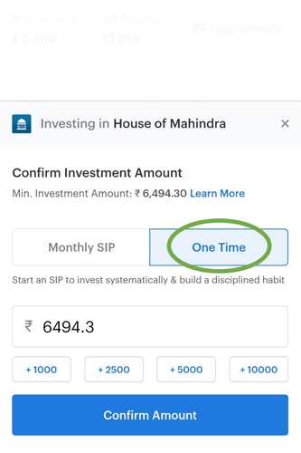 - Choose between Monthly SIP or One Time & confirm the amount