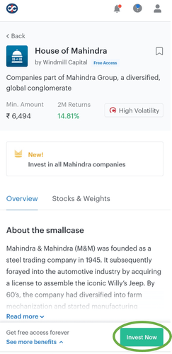 - After selecting a smallcase, click on the "Invest Now" button