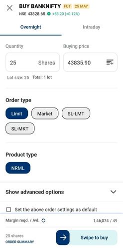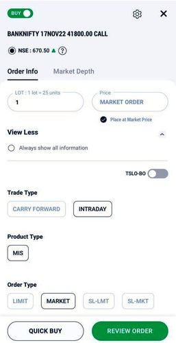 - Enter the lot size and price, and click on View More. Select Trade Type as Intraday for which by default Product Type will be available as MIS.