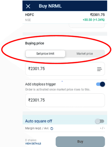 To place a cover order, you can select either SL-Market or SL-Limit and enter the Stop Loss trigger price.