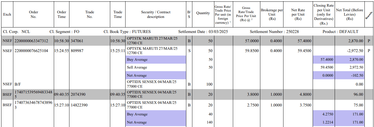 - Net Average: (Buy Avg – Sell Avg ) Qty Column is blank because it’s netted off in this case. And net total is 2870.00-2972.50 = -102.50