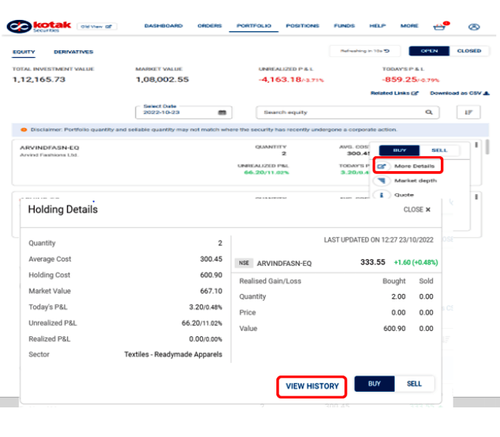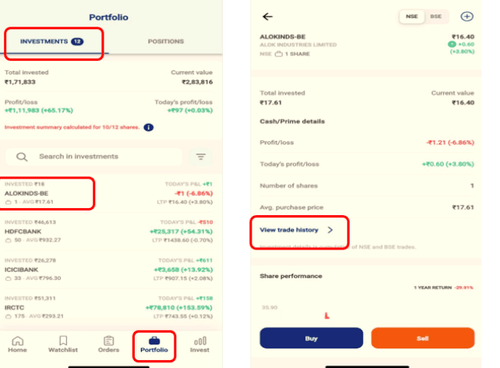 Go to Portfolio → Select Stock → Go to More Details → View History