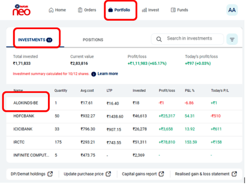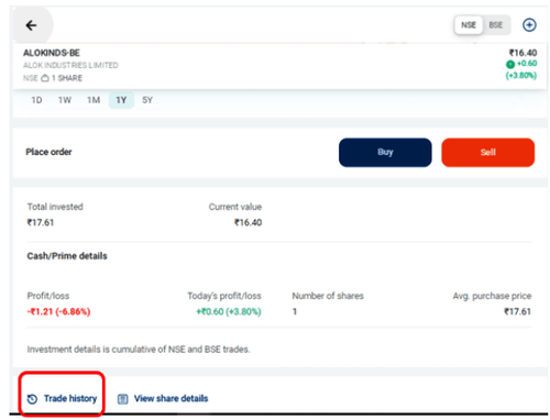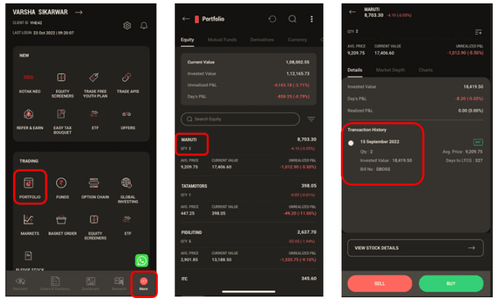 Click on More → Go to Portfolio → Select Stock → View the Transaction History